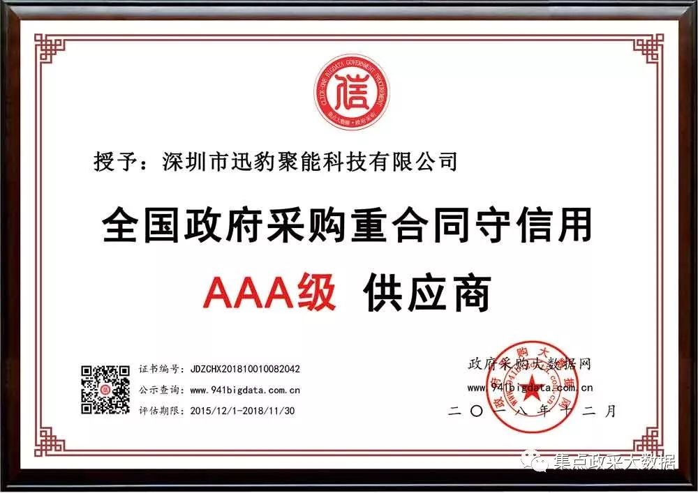 熱烈祝賀,迅豹聚能榮獲“全國(guó)政府采購(gòu)重合同守信用AAA級(jí)供應(yīng)商”證書(shū)