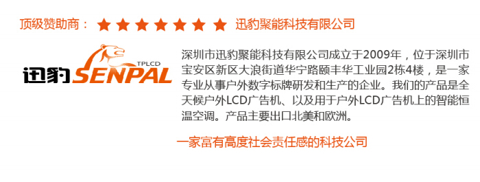 深圳市迅豹聚能科技有限公司成立于2009年,是一家專(zhuān)注于全戶(hù)外液晶顯示系統(tǒng)的研發(fā)、生產(chǎn)、銷(xiāo)售為一體的國(guó)家級(jí)高新技術(shù)企業(yè)。經(jīng)過(guò)近十年的高速發(fā)展,迅豹已成為戶(hù)外廣告機(jī)十大知名品牌。創(chuàng)新能力是迅豹能后來(lái)居上、跨越式發(fā)展的重要原因,創(chuàng)新基因已深深嵌入迅豹人的思維習(xí)慣、商業(yè)模式和行動(dòng)執(zhí)行等方方面面。