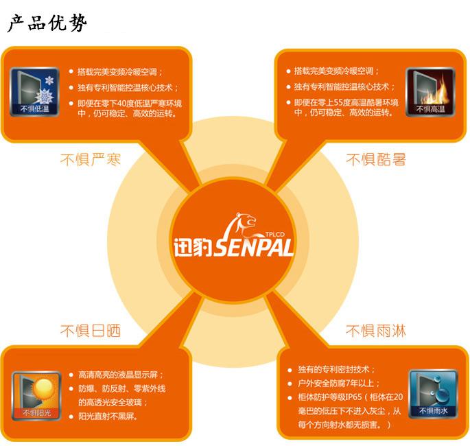 迅豹智能戶外液晶廣告機(jī)所搭載的智能變頻空調(diào)散熱系統(tǒng)、熱交換散熱系統(tǒng)、太陽輻射感應(yīng)節(jié)能系統(tǒng),不僅促進(jìn)行業(yè)未來發(fā)展趨勢,還應(yīng)用了云平臺信息發(fā)布系統(tǒng)、戶外遠(yuǎn)程監(jiān)控系統(tǒng)連接互聯(lián)網(wǎng)平臺,便于城市社區(qū)服務(wù)站、公交站、高速公路等人群集中地點的信息傳播更加快捷、高效。