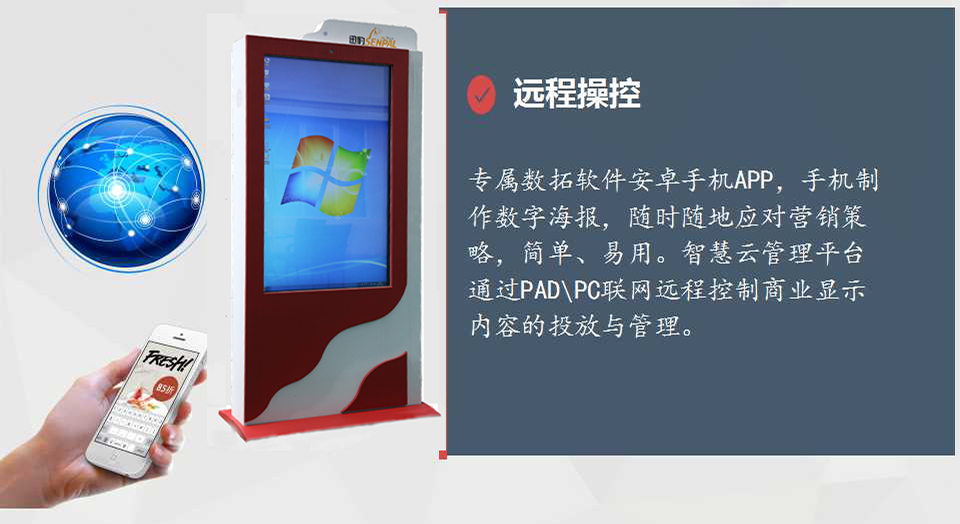 背掛式戶外廣告機(jī):我們可以提供42-82寸的戶外液晶廣告機(jī)并可集成觸屏。