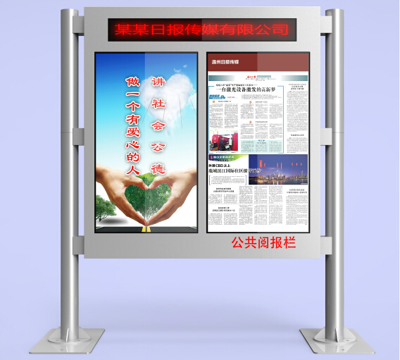 深圳迅豹全戶外電子閱報(bào)欄,以觸摸屏為閱讀和顯示終端,原汁原味的數(shù)字報(bào)刊展現(xiàn)形式,新穎別致的交互體驗(yàn)方式,向讀者提供觸摸讀報(bào)服務(wù),可幫助機(jī)構(gòu)用戶提高整體公眾形象和讀者服務(wù)水平。此款機(jī)器是一款造型美觀,方便實(shí)用的集閱報(bào)和廣告信息發(fā)布等功能于一身的媒體設(shè)備。采用55寸互動(dòng)液晶廣告機(jī)雙屏形式??蛇M(jìn)行電子報(bào)紙的閱讀、廣告發(fā)布、信息查詢、優(yōu)惠券打印、政策法規(guī)宣講、時(shí)政實(shí)時(shí)展播、新聞及時(shí)發(fā)布、知識(shí)宣傳、優(yōu)秀人物報(bào)道、重大活動(dòng)告示、通知播放、商情發(fā)布、文化宣傳、教學(xué)、演講、演示、會(huì)議、時(shí)間、引導(dǎo)顯示、視頻展播、集中信息展示發(fā)布等,企業(yè)形象、政府政策的及時(shí)報(bào)道和宣傳等。