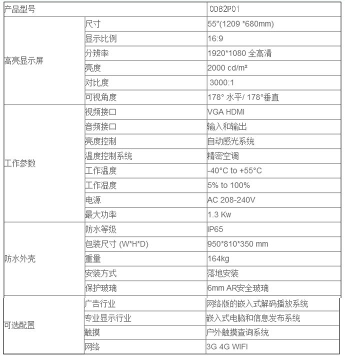 戶外電子閱報欄OD82P01參數(shù)如下: