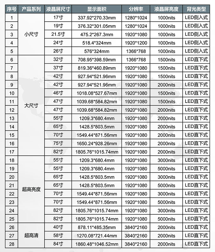 迅豹高亮液晶顯示屏尺寸表